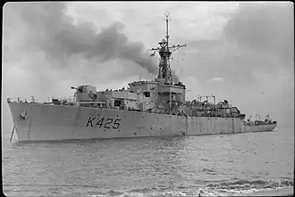 Commissioning in June 1944 with the pennant number K425,[12] the ship was allocated for service in the 10th Escort Group based on the Clyde.[10] In August she was attached to the 20th Escort Group to prepare for Russian convoy duty,[12] but on 12 August 1944[a] was in collision with the destroyer Bulldog.[10] While Loch Dunvegan was quickly repaired, Bulldog was more severely damaged, and did not return to service until September that year.[10][13] On 15 August Loch Dunvegan left Loch Ewe as part of the close escort for Convoy JW 59 to Murmansk.[14] On 24 August Loch Dunvegan, together with the destroyer Keppel and the sloops Mermaid and Peacock took part in the sinking of the German submarine U-354.[15] The next day the convoy arrived at Kola Inlet and Loch Dunvegan was detached to prepare for the return convoy, and left the Kola Inlet on 28 August with Convoy RA 59A for the return journey.[10][15]