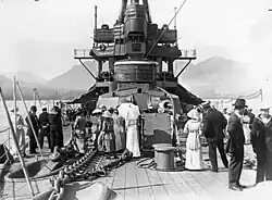 New Zealand reached Wellington in New Zealand on 12 April where over the course of her stay in the capital 98,170 citizens visited her, being conveyed out to where she was moored in the harbour by a fleet of steamers.[7][8] This was the start of an event that gripped the country as thousands of New Zealanders came to catch a sight of and where possible visit "our Dreadnought." For the ship's crew this meant having to attend a constant parade of events and festivities. The ship's detailed itinerary in New Zealand was overseen by Francis Henry Dillon Bell, Minister of Internal Affairs and acting Minister of Marine.[9] The government cable ship Tutanekai was allocated to accompany the battlecruiser around the country and transport people out to the battlecruiser if it drew too deep a draught to dock or safely anchor.[9]