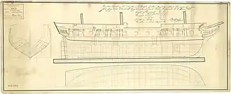 Princess Charlotte was designed by George Record of the Kingston Royal Naval Dockyard in Kingston, Upper Canada. The frigate was constructed under private contract by the master shipwright John Goudie. The vessel measured 755 90⁄94 tons burthen and was 121 ft 0 in (36.9 m) long overall and 100 ft 0+3⁄8 in (30.5 m) long at the keel.[a] The frigate had a beam of 37 ft 8 in (11.5 m) and a draught of 14 ft 4 in (4.4 m). The frigate's hold had a depth of 8 ft 8+1⁄2 in (2.7 m). The frigate was pierced for 40 gunports but carried 42 guns. Princess Charlotte was armed with twenty-four 24 pdr (11 kg) long guns on her upper deck and sixteen 32 pdr (15 kg) carronades and two 68 pdr (31 kg) carronades on her quarterdeck and forecastle. The vessel had a complement of 280 officers and enlisted.[2][3]