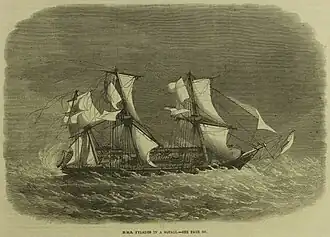 The ship, now rated at 1,278 bm, departed for the North America and West Indies Station on 13 January 1863 under the command of Captain, later Admiral, Arthur Acland Hood.[16] While serving in Canada, the vessel played a role in the Chesapeake affair that took place during the American Civil War. When the British sailing vessel Chesapeake, captured by Confederate sympathisers and pursued by US Navy warships, arrived in Canadian waters, the vessel's presence helped stop the situation escalating to a declaration of war between the British Empire and Union forces.[17] By this time, the corvette was old and was deemed unlikely to last beyond 1868.[18] The vessel returned to the Nore on 29 October 1866 for an extensive overhaul, which extended the ship's life substantially.[19] Recommissioned on 4 December 1867 the vessel served under the command of Captain Cecil Buckley, later a recipient of the Victoria Cross, as part of the Pacific Station until 1870 and then off the coast of South America between 20 July 1871 and 20 August 1873 under the command of Captain Augustus Chetham Strode. The ship was finally decommissioned on 31 December at Sheerness. Pylades was sold to be broken up on 23 January 1875 to Castle in Charlton.[2][20]