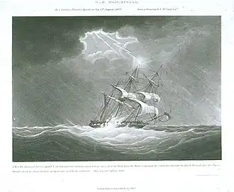 Sharpe reported that on 6 August 1843 lightning had struck Scylla. He further reported that had she not been fitted with lightning conductors she would have lost her mainmast.[30] It is this storm that was the subject of the drawing above.