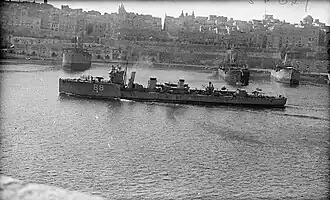Sheldrake was assigned to the Fifth Destroyer Flotilla as part of the Mediterranean Fleet.[20] On 23 March 1916, the destroyer rescued 166 crew members and the sole passenger from the horse fodder transport Minneapolis that had been sunk by the German submarine U-35.[21] On 27 April, Sheldrake attempted to tow the sloop HMS Nasturtium, stricken after hitting a mine. However, the poor weather and sloop's increasing list meant that the operation was unsuccessful and the ship sank the following day.[22] For the remainder of the war, the destroyer saw service, frequently escorting troopships including Ivernia, which sailed with 2,500 troops from Alexandria to Marseille, on 26 and 27 June, protecting them from submarines and mines.[23] Sometimes simply having an escort was sufficient to deter attack. On 2 June 1917, the ship was escorting the transport Minnetonka when U-35 approached, but could not get close enough to launch an attack due to the presence of the destroyer.[24] On 20 January 1918, Sheldrake was attached to the Aegean Squadron, undertaking patrols as well as escort work.[25]