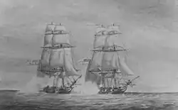 In December, Sophie, again working with Acteon, destroyed or captured seven small prizes.[10] On 11 December they burnt a schooner of 37 tons. The next day they captured the 76-ton schooner Erie and its crew of nine men.[13] (The Erie, under the command of John Hearn, had been sailing from Havana to Baltimore with a cargo of sugar and coffee. The British unloaded the cargo and afterwards sent it to Bermuda, thereafter employing Erie as a tender to the British squadron in the Chesapeake.[14] There Erie too captured several prizes.) Still on 12 December, Sophie and Acteon burnt two small schooners, one of 25 and one of 60 tons.[13] Then on the 16th they burnt the Little Elenea, of 59 tons and two men, sailing from Charleston to Baltimore. On the same day they also burnt a 69-ton sloop. The next day Sophie burnt the Antelope, also of 69 tons and also sailing from Charleston to Baltimore.[13] In addition, Sophie and a number of other vessels shared in the prize money for the capture of the brigs George and Betsey, both taken on 23 December.[15]