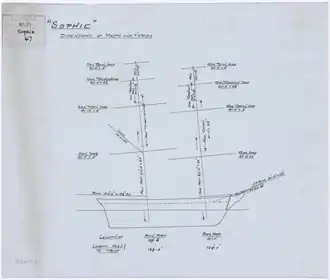 ![]() A profile plan showing the dimensions of masts and yards for Sophie