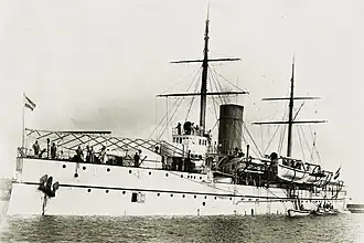 On 11 March that year she departed from the port of Vlissingen bound for the Dutch West Indies in response to rising political tension between the Netherlands and Venezuela to evacuate the Jews of Coro to Curaçao. She interrupted this journey to assist and help the casualties of the Mount Pelée volcano eruption on the French island of Martinique.[3] After this, the ship continued her journey in concert with HNLMS Utrecht and on 2 April 1902 they arrived in the Venezuelan port of La Guaira. Prior to their arrival, the Venezuelan Navy had repeatedly checked Dutch and Antillean merchant ships and the presence of the Dutch warships acted as a deterrent against further actions.[2]