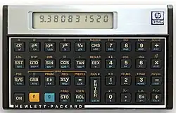 The HP-15C is a high-end scientific programmable calculator of Hewlett-Packard's Voyager series produced between 1982 and 1989. The "C" in the name refers to the continuous memory, such that the calculator retains it's state when switched off.