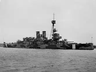 At the cusp of the Second World War, in September 1939, the ship was recommissioned. An assessment of the weaponry found it was outdated. Particularly, it was considered that the main armament, which had a daytime range of 9,000 m (30,000 feet) but only 2,000 m (6,600 ft) at night, would be easily outranged by modern German and Soviet guns.[11] The engines were in poor condition, with the vessel incapable of exceeding 16 knots (30 km/h; 18 mph). The anchor chain and other equipment was also tired and needing replacing.[14] A refit was undertaken, in which the tertiary artillery was replaced by four Bofors 57 mm (2.2 in) and two Bofors 25 mm (1 in) anti-aircraft guns added.[15] During the following year, the torpedo tubes were removed and two Bofors 40 mm (1.6 in) anti-aircraft were added.[4] The warship joined the squadron at Åland, returning to Karskrona before long.[16] In 1942, the ship was decommissioned, hulked and redeployed as a floating barracks. After the war, Sweden decided to retire the whole fleet of coastal defence ships. On 13 June 1947, Äran was taken out of service and, in 1951, was sold to Marinverkstaderna of Karlskrona to be broken up. The vessel was partially cut up, some of the hull being repurposed as a pontoon near Falkenberg. This sank on 1 November 1968 at a depth of 32 m (105 ft).[4]