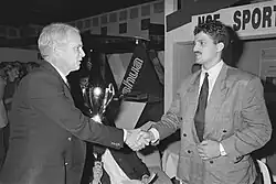 Jacques Josten (right) receives the prize for Dutch handball player of the year 1988 from the Federal President of the NHV (Luub Hafkamp, left).