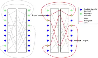 A diagram of a loopback-rotor construction; in this simplified example, two rotors with nine contacts each are used. There are six inputs and outputs, leaving three loop-back wires.