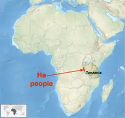 The Ha, also called Abaha (Waha in Swahili), are a Bantu ethnic group found in Kigoma Region in northwestern Tanzania bordering Lake Tanganyika.[1][2] In 2001, the Ha population was estimated to number between 1 and 1.5 million, making them one of the largest ethnic groups in ethnically diverse Tanzania.[1][3][4]