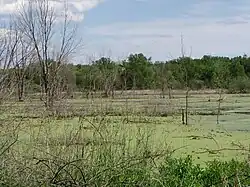 At the west end of the Indiana Dunes, in Gary there is a dune and swale province of the system. The area is characterized by low, linear sand ridges, parallel to the shoreline. Between these ridges are low areas of marsh or ponds. The ridges are characterized by prairie and savanna life forms and the marsh areas and ponds by the plants and wildlife of those characteristic areas of the dune lands. The dune and swale topography is easiest to see in the Miller Woods area of the park. Much of the dune and swales was eliminated by the construction of the industrial plants of Gary, East Chicago, Whiting and Hammond.[1] Some key identifiers of a dune and swale community include the common yellowthroat, Blanding's turtle, and bluehearts.