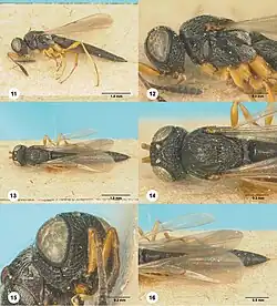 Female is larger than male. Body length of female is about 4.36โ4.72 mm, whereas male is 4.15โ4.52 mm. Mesosoma and metasoma are black. Antennae punctate rugose to smooth. Central keel absent.[1]