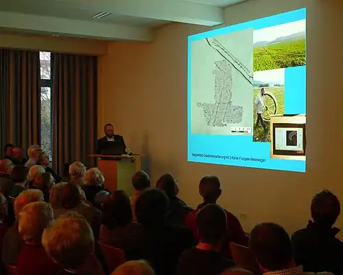 A pointed trench on the south side is found at 425 m. In the east, a rounded section of the same length follows a round corner. In the northeast is a geophysical prospected entrance with an upstream trench ("Titulum"). Eight ovens with a working pit complete the previously excavated structures. The system continues in the north and west in a similar way, so there it is an irregular square with an enclosed space of at least 18 hectares. Among the still not very numerous finds, there are the non-metallic objects belonging to Roman equipment and four iron shackles.Mario Küßner[5]