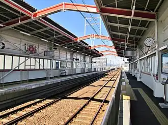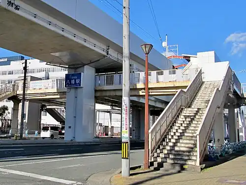 The station is an elevated station with dual opposed side platforms. It is staffed during daylight hours. The station building has automated ticket machines, and automated turnstiles which accept the NicePass smart card, as well as ET Card, a magnetic card ticketing system.