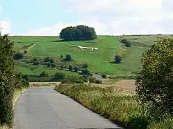 At the top of the hill is a car park where the Ridgeway crosses the B4041 road, and a footpath stretches from there down to the horse, making the horse accessible to the public.[2] Ironically, many real horses often roam the field.[3] It has been suggested that the stones for Stonehenge and Avebury may have come from a field of sarsen stones just to the south east of its location.[3] The expression "as different as chalk and cheese" is sometimes believed to refer to the land divided by Hackpen Hill. The hill forms the boundary between the high chalk downs to the south of it and the clay cattle country to the north, where cheese is a product of the milk from the cattle, so the two areas "are as different as chalk and cheese."[4] Hackpen White Horse was not the only hillside shape cut to commemorate Queen Victoria; in 1887, for her Golden Jubilee, a hillside row of trees were planted in the shape of a "V" in Westmeston, Sussex.[5]