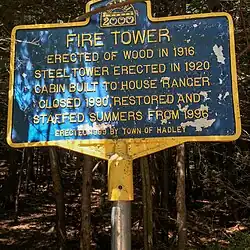 There is a plaque at the base of the trail which leads to the fire tower. The plaque states that the original wood tower was erected in 1916. The current steel tower was built in 1920.[3]