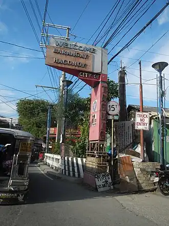 The area south of Wawa settlement was flourished with a plant called "hagunoy". That area later became known as Hagonoy.[3]: 204 It was visited by Chinese merchants during the Ming dynasty, who traded products such as bowls, plates, glasses, and cups.[4] During the Spanish rule of the Philippines, Taguig became a pueblo (town) of the province of Manila on April 25, 1587,[3]: 28 in which Hagonoy was one of its nine original barrios.[5] It was then administered by Claro Cuevas as the village president (Filipino: pangulo ng nayon) after the country declared its independence from Spain on June 12, 1898.[3]: 29 Hagonoy remained as a barrio until it was converted into a barangay by virtue of Presidential Decree No. 557 signed by then-President Ferdinand Marcos on September 21, 1974.[6] The barangay was reduced in size after the Sangguniang Panlungsod of Taguig passed City Ordinance No. 24 to separate the San Miguel Proper from its jurisdiction to form an independent barangay to be known as San Miguel, which was ratified through a plebiscite on December 28, 2008.[7]