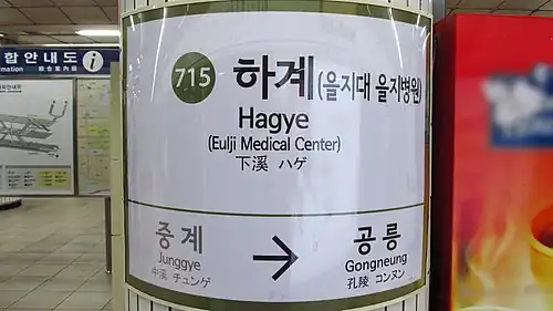 Hagye Station (Korean: 하계역) is a station on the Seoul Subway Line 7 in Nowon District, Seoul, South Korea.[2] The name comes from the name of the dong it is located in, and is named after its location at the lower parts of Hancheon.[1][3][4]