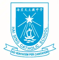 The current school crest is a shining star with a boat underneath it, to represent the school as the "Star of the Sea". A banner contains the Latin words, Ad Veritatem Per Caritatem (To truth (God) through charity) below the logo. The school crest was created in 1959 under the name, Hai Sing Girls' School. After they changed their policy to accept boys and students of other races in 1990, the school crest was redesigned under the name Hai Sing Catholic School in 1992 after changing it from Hai Sing High School.[17]