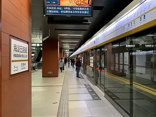 Haidian Wuluju (Chinese: 海淀五路居站; pinyin: Hǎidiàn Wǔlùjū Zhàn) is a station on Line 6 of the Beijing Subway.[1] It was opened on December 30, 2012.[2][3] The station was the terminus of the line until it was extended west to Jin'anqiao on December 30, 2018.