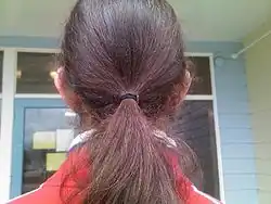 A hair tie (also called a ponytail holder, hairkeeper, hair band, hair elastic, wrap around, gogo, or bobble) is a styling aid used to fasten hair, particularly long hair, away from areas such as the face. This is usually done as part of a hairstyle such as pigtails, bunches, or ponytails for straight, wavy, and loosely curled hair, and referred to as afro puffs, bunny tails, and "pineapples" for highly curled and highly textured natural hair. Two common types of hair tie are the scrunchie[1] and the elastic. The term can also include a fixed tie or rubber band which is placed through or around strands to hold specific parts of hair together, rather than tie it or clasp them together like a hair clip.