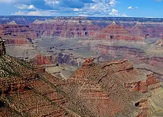 The Hakatai Shale is a Mesoproterozoic rock formation with important exposures in the Grand Canyon, Coconino County, Arizona. It consists of colorful strata that exhibit colors varying from purple to red to brilliant orange. These colors are the result of the oxidation of iron-bearing minerals in the Hakatai Shale. It consists of lower and middle members that consist of bright-red, slope-forming, highly fractured, argillaceous mudstones and shale and an upper member composed of purple and red, cliff-forming, medium-grained sandstone. Its thickness, which apparently increases eastwards, varies from 137 to 300 m (449 to 984 ft). In general, the Hakatai Shale and associated strata of the Unkar Group rocks dip northeast (10–30°) toward normal faults that dip 60° or more toward the southwest. This can be seen at the Palisades fault in the eastern part of the main Unkar Group outcrop area (below East Rim). In addition, thick, prominent, and dark-colored basaltic sills and dikes cut across the purple to red to brilliant orange strata of the Hakatai Shale.[3][4][5]