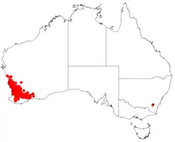 Marble hakea is endemic throughout a large area of the Wheatbelt, Great Southern and Goldfields-Esperance regions[2] of Western Australia from Northampton in the north west to Ravensthorpe in the south east. It is found in open low heath communities[3] where it is found in sandy or gravelly soils around or over laterite or granite.[2]
