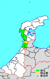 * yellow - areas formerly within the district borders during the early Meiji period
