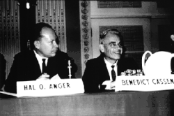 Hal Anger and Benedict Cassen at the International Conference on Peaceful Uses of Atomic Energy in Geneva, Switzerland, 1955