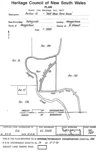 - ^ a b "Half Moon Farm House". New South Wales State Heritage Register. Department of Planning & Environment. H00288. Retrieved 1 June 2018.