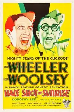 Half Shot at Sunrise is a 1930 American pre-Code comedy film starring the comedy duo Wheeler & Woolsey and Dorothy Lee. Their fourth film together, it was the second starring vehicle for the two, following the success of The Cuckoos, which had been released earlier in 1930. Directed by Paul Sloane, from a screenplay by Anne Caldwell, James Ashmore Creelman, Ralph Spence, and Fatty Arbuckle, which had been tailored to highlight the comedic talents of Wheeler and Woolsey. In 1958, the film entered the public domain in the United States because the claimants did not renew its copyright registration in the 28th year after publication.[3]