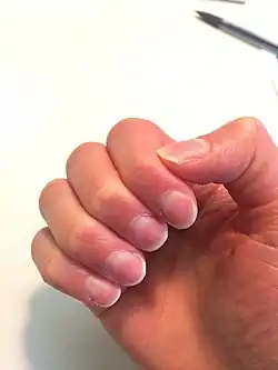 Half and half nails (also known as "Lindsay's nails") show the proximal portion of the nail white and the distal half red, pink, or brown, with a sharp line of demarcation between the two halves.[1]: 785 The darker distal discoloration does not fade on pressure,[2] which differentiates Lindsay's nails from Terry's nails. The discoloration is thought to be due to β-melanocyte–stimulating hormone.[2] Seventy percent of hemodialysis patients and 56% of renal transplant patients have at least one type of nail abnormality. Absence of lunula, splinter hemorrhage, and half and half nails were significantly more common in hemodialysis patients, while leukonychia was significantly more common in transplant patients.[1]: 785 [3]: 659