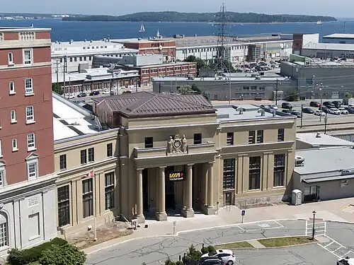 The new, and present, station opened on June 19, 1930[1] at the south end of Hollis Street, opposite Cornwallis Park. The structure is constructed of white limestone and has a colonnaded entry off Hollis Street. Inside, the Ticket Lobby has a high arched ceiling with a seated waiting area and ticketing/baggage counters. At the time of its construction, the station had a massive covered train shed which extended for 1,500 feet south over the station tracks to protect passengers boarding and disembarking from the weather. The earlier 1920 "temporary" station was converted to an attached baggage and express shed. CNR also had a coach yard with repair/service shop facilities for its passenger train equipment immediately southwest of the station's trainshed. Finally, a turn-table was located immediately southeast of the trainshed to permit locomotives and cars to be turned around, since the station was a stub-end terminal.