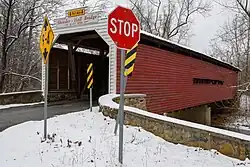 This structure has two spans and is a 100-foot-long (30 m), Burr truss bridge, which was built in 1850. It is the oldest covered bridge in Chester County, and crosses French Creek, just downstream of its confluence with Birch Run.[2]