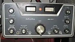 The SX-117 was a triple conversion intermediate frequency receiver designed to cover the 10 meter to 80 meter amateur radio bands with an additional band switch setting for WWV on 10 MHz. The first and third conversion oscillators were crystal-controlled. The second was variable from 6 to 6.5 MHz. Introduced in 1962 at a price of $379.95, it had a product detector for SSB, a notch filter, and selectable bandwidth of 0.5, 2.5, and 5 kHz. In addition to the ham bands, general coverage was possible for most frequencies in 500 kHz segments from 85 kHz to 30 MHz with appropriate crystals. For frequencies below 3 MHz, the HA-10 LF/MF converter was an optional accessory costing $24.95. The receiver featured 13 vacuum tubes plus solid state rectifiers and a noise limiter.[1]