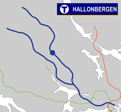 Hallonbergen is a station on the blue line of the Stockholm metro, located in Sundbyberg. The station was opened on 31 August 1975 as part the first stretch of the Blue Line between T-Centralen and Hjulsta. The trains were running to Hallonbergen and then continued to Rinkeby via a track which is currently used for the rail yard access. On 5 June 1977, the extension north to Akalla was opened.[2] The station's interior is covered with art intending to mimic kids' paintings done by Elis Eriksson and Gösta Wallmark.