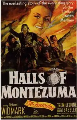 Halls of Montezuma is a 1951 American World War II war film directed by Academy Award-winner Lewis Milestone and starring Richard Widmark. It also stars Robert Wagner in his first credited screen role and features Richard Boone in his feature-film debut. The story is about U.S. Marines fighting on a Japanese-held island, and the title is a reference to the opening line from the Marines' Hymn.