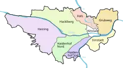 As a result of the Gemeindegebietsreform (territorial reform), which came into effect on July 1, 1972, the former market of Hals became a neighborhood of Passau,[2] although there would be a plebiscite, only 13 of the 113 electors supported incorporation into Passau, while the larger share supported a merger with Grubweg. The current neighborhood has a population of 1,695 residents (12/31/2005)