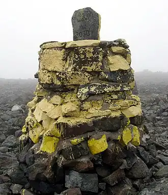The highest point in Finland is on a spur of Ráisduottarháldi at 1,324 m (4,344 ft) known as Hálditšohkka at the border of Norway. The peak proper is not in Finland; the border marker is on a slope.[3] The highest peak of a mountain that is entirely in Finland is Ridnitšohkka, at 1,316 m (4,318 ft) and a few kilometers from Halti.