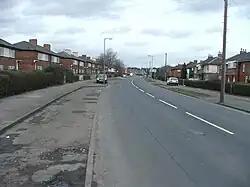 Halton Moor was built as a low density garden suburb, one of several constructed in Leeds in the 1930s and 1940s.[4] It is set on the side of a hill overlooking East End Park and Leeds City Centre. The western boundary of Halton Moor is marked by Wyke Beck, a tributary of the River Aire which rises in Roundhay Park and discharges into the River Aire at Rothwell.[5]