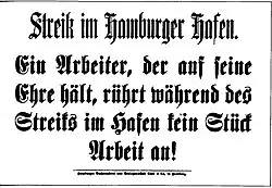The Hamburg dockworkers' strike of 1896-97 is considered one of the largest labour disputes in the German Empire. It began on November 21, 1896, lasted eleven weeks, involved nearly 17,000 workers at its peak, and ended on February 6, 1897, with the complete defeat of the strikers. The dispute had a significant impact on the Hamburg economy and also caused a stir outside Germany. The events prompted conservatives and the Reich government to attempt a policy of increased repression against social democracy two years later with the prison bill.[1]