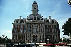 Hamilton County Courthouse Square is a historic courthouse and jail located at Noblesville, Hamilton County, Indiana. The jail was built in 1875–1876, and is a Second Empire style brick and limestone building. It consists of the two-story, ell-shaped jailer's residence, with a cellblock attached at the rear. It features a three-story square tower that once had a mansard roof. The courthouse was built between 1877 and 1879, and is a three-story, Second Empire style, rectangular brick building. It has a clock tower atop the mansard roof and limestone Corinthian order pilasters.[2]