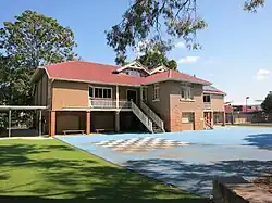 Other additions to the site have been made. Hamilton State School showed a strong interest in sport from early in its history, with a netball court on-site by July 1925 and a tennis court in situ by May 1930, both on the north side of the school building.[85][86][87] Although sporting facilities were limited by the small size of the school's grounds, venues outside the school were used, for instance, in 1953 the school used the Hamilton Shift-workers Rugby League Club Oval at Hamilton.[88] A parade ground was created east of the school building by 1967.[89] The tennis court was converted to a multipurpose court by 1998.[90] The site of the netball court gained a new purpose in 2012 when a federally funded library-administration block was constructed in the northwest corner of the site, adjacent to the tennis court.[91] A preschool building has been added in the southwest of the grounds.[1]