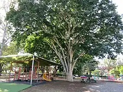 Arbor Day was celebrated at Hamilton State School from at least 1912. By 1925 there were 39 trees planted in the school grounds including: Weeping figs (Ficus benjamina), Moreton Bay chestnuts (Castanospermum australe), Cocos or Queen palms (Syagrus romanzoffiana), Macadamia nut trees (Macadamia integrifolia), Camphor laurels (Cinnamomum camphora) and Candlenut trees (Aleurites moluccanus).[42] Aerial photography dating from 1936 shows extensive tree planting along all boundary fences, except along the eastern half of the southern boundary.[43] In July 1941 a pergola over the front steps of the school building was completed at a cost of £4.[44][1]