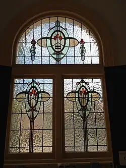 The entrance to the library consists of a vestibule with Art Nouveau-styled leaded glass windows and tessellated/encaustic floor tiles. Some floor tiles are replicas laid down in 2004. Only a small section of the border pattern consists of the original tiles, the others being specially made replicas laid in 2004. Panels in the French doors opening into the library and sections on either side of the doors are all matching leadlight.[1]