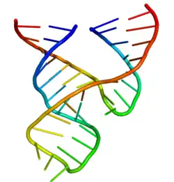 The hammerhead ribozyme is an RNA motif that catalyzes reversible cleavage and ligation reactions at a specific site within an RNA molecule. It is one of several catalytic RNAs (ribozymes) known to occur in nature. It serves as a model system for research on the structure and properties of RNA, and is used for targeted RNA cleavage experiments, some with proposed therapeutic applications. Named for the resemblance of early secondary structure diagrams to a hammerhead shark,[1] hammerhead ribozymes were originally discovered in two classes of plant virus-like RNAs: satellite RNAs and viroids. They are also known in some classes of retrotransposons, including the retrozymes.[2] The hammerhead ribozyme motif has been ubiquitously reported in lineages across the tree of life.[3][4]