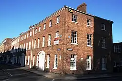 Sir Benjamin Hammet was born in Taunton around 1736, and was a Member of Parliament for the town from 1782 until his death in 1800.[2] In the late 1780s, a number of Acts of Parliament were passed to make improvement to town and city centres,[3] and Hammet carried such an Improvement Act for Taunton through in 1788. The Act allowed Hammet to purchase two houses on Fore Street, one occupied and the other empty, and demolish them to make way for the new road.[4] The road built ran directly towards the Church of St Mary Magdalene, which had previously been accessible only via a narrow lane. Hammet Street is 36 feet (11 m) wide at its narrowest point, designed to allow carriages to travel to the church without endangering pedestrians. In his history of Taunton, Joshua Toulmin describes the terraces along Hammet Street as "handsome houses", and praises the way the street opened up the view of the church from the town centre.[4] The original houses remain, and the ground floors of many are currently used as estate agents.[5]