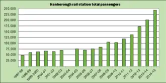 Passenger numbers fluctuated until 2005–06, when the Office of the Rail Regulator estimated that the total number for that year was just above 70 thousand. The number of passengers increased rapidly to 2015-16 was more than 271 thousand, but fell back to 224 thousand following the opening of Oxford Parkway before recovering to 275 thousand in 2019-20.[1]