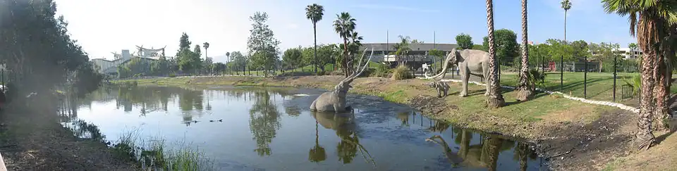 The park's destinations include the La Brea Tar Pits; the adjacent George C. Page Museum of La Brea Discoveries, which displays the fossils of Ice Age prehistoric mammals from the tar pits; and the Los Angeles County Museum of Art (LACMA) complex.[2] They are among the most popular tourist attractions in Los Angeles.