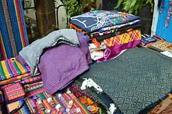 Textile designs in Chiapas are very similar to those of Guatemala, as they come from the same origin.[8] Most of the designs are in strong colors such as red, yellow, turquoise blue, white, purple, pink and deep green but some pastels are also combined with these. Motifs include flowers, butterflies and rainforest birds.[1] The growth of handcraft production has meant diversification in designs and products, especially in textiles, both in weaving and embroidery.[3] Synthetic fibers are making their way into pieces, either used to make the cloth or added as embroidery.[8] Embroidery designs can come from more common inspiration. For example, many of the textiles of Aguacatenango have four-petaled flowers mimicking those on the facade of the San Agustin Church, which dates from the 17th century.[3]